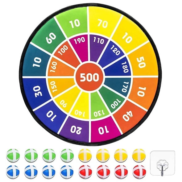 28.7 inch large dart board set: each darts board set contains a 28.7 inch dart board, 16 sticky balls (4 red & 4 blue & 4 green & 4 yellow) and a hook. The dart board is large enough making it easier to hit, bring more fun for kids and beginners.